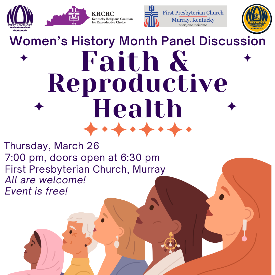 West KY NOW panel discussion "Faith and Reproductive Health." doors open at 6:30 pm, 7:00 start. First Presbyterian Church, Murray. Panelists include Rev. Muriel Schmid, Executive Director KRCR (KY Religious Coalition for Reproductive Choice), Rev. Brittany Sutherland, Pastor, First Presbyterian Church of Murray, and Li Irvine, Episcopal Campus ministry & MSU NOW CAN secretary. The panel will take place that the First Presbyterian Church in Murray.