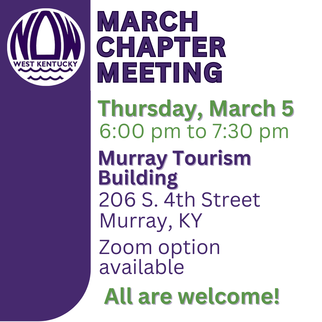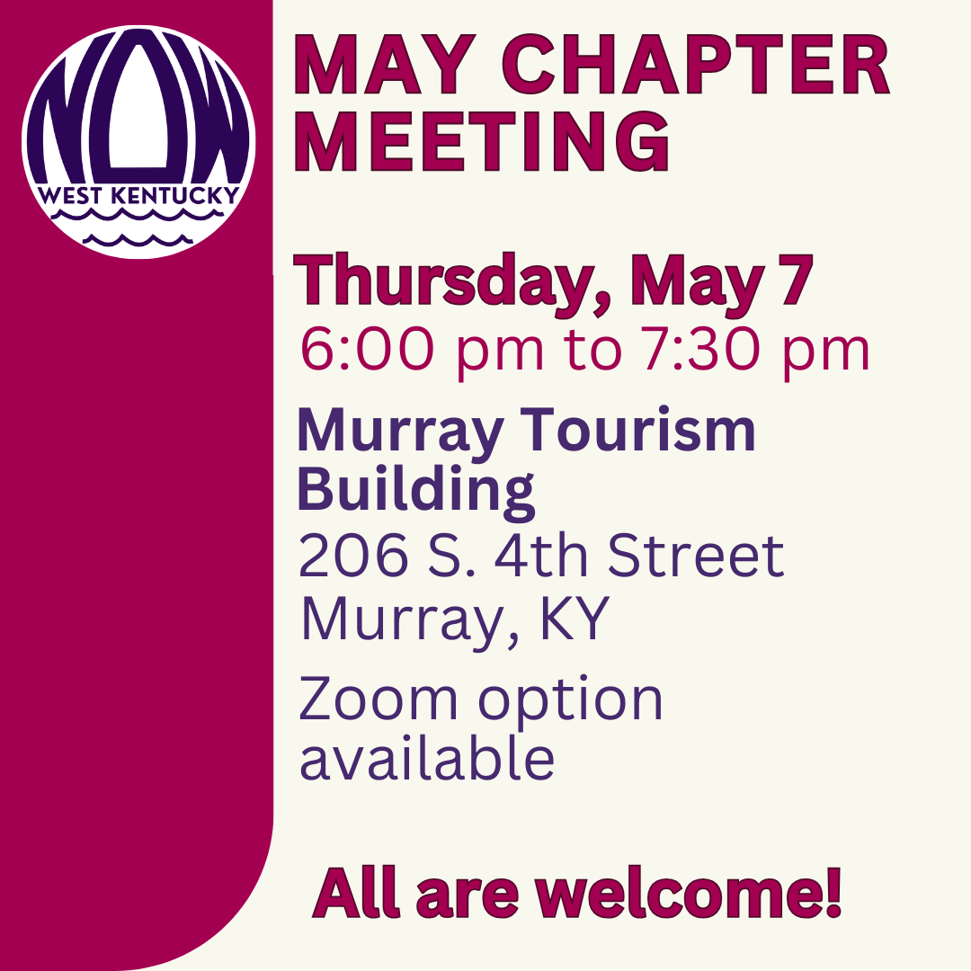 West KY NOW Chapter Meeting, 6:00 pm-7:30 pm, Murray Convention and Visitors Bureau, 204 S. 4th Street, Murray.